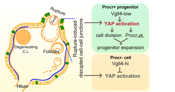 3月15日,国际学术期刊 Elife 在线发表了中国科学院分子细胞科学卓越创新中心(生物化学与细胞生物学研究所)曾艺研究组、张雷研究组与浙江大学附属儿童医院傅君芬教授团队的合作研究成果 “YAP activation in Procr cells is essential for ovarian stem/progenitor expansion and epithelium repair ”。该研究揭示了 YAP 在 Procr 干细胞选择性激活促进干细胞扩增从而促进卵巢上皮排卵后修复的机制。