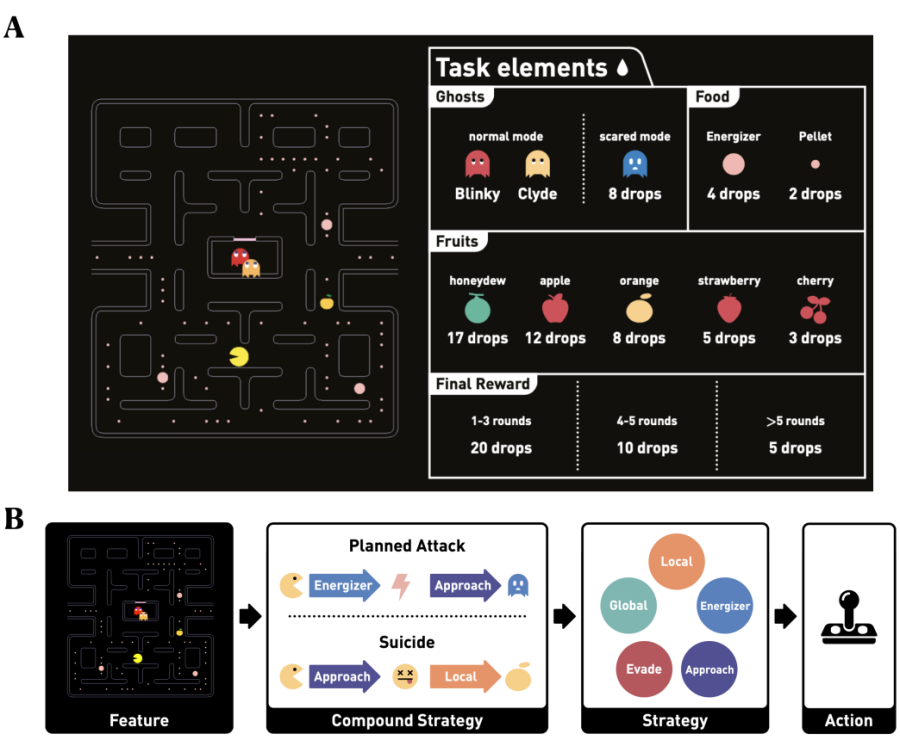 图注(A)吃豆人行为范式。 (B) 猕猴用分层决策的策略解决吃豆人任务。该策略在最低级别,为操纵杆的移动做出决定:向上、向下、向左或向右。在中间层,在策略基组之间进行选择。在更高的层次上,可以将简单的策略拼凑成更复杂的复合策略基组。