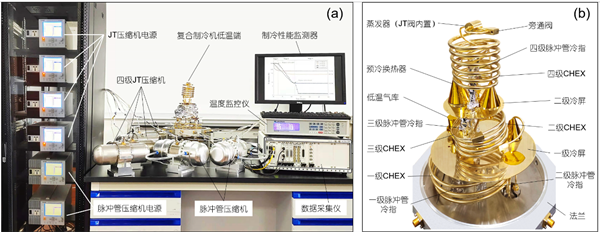 上海技物所1~2 K温区复合制冷机典型实物图:(a)系统整体布置; (b) 低温端细节