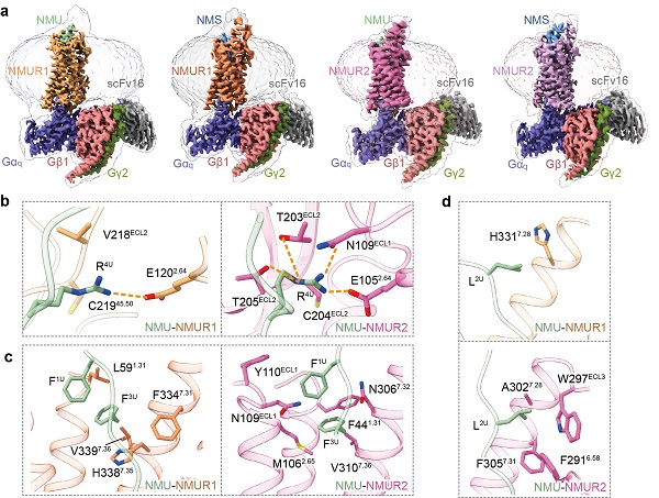 图1. 神经肽U受体1和2分别与神经肽U和神经肽S复合物的冷冻电镜结构。a. NMUR1/2分别与神经肽激素NMU和NMS及其Gq蛋白复合物的4个冷冻电镜结构;b-d. NMU和NMS的L2P-F3P-R4P序列分别于NMUR1和NMUR2配体口袋残基的识别模式比较。