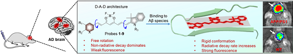 近红外荧光成像由于具有灵敏度高、成像快捷、操作简便等优点,已被广泛应用于疾病标志物的检测中。近年来,研究人员也相继开发了Aβ蛋白响应的荧光探针用于Aβ蛋白的检测。但是,目前报道的荧光探针大多还存在荧光发射波长较短,与Aβ蛋白的结合动力学过程较慢、亲和力较低,以及仅能检测AD病程较晚期的Aβ蛋白斑块等不足。因此,发展具有近红外荧光发射波长,对Aβ蛋白单体、寡聚体和聚集体具有快速响应和高亲和力的近红外荧光探针用于活体内Aβ蛋白的高灵敏度和高特异性检测,对AD的早期诊断和疗效监测具有重要意义。