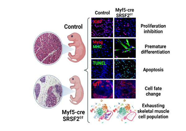 剪接蛋白SRSF2是细胞存活的关键调节因子。冯英组以前的研究表明SRSF2在小鼠肝脏发育和肿瘤的发生发展过程中发挥重要的调控作用(Mol Cell Biol.2016; Cancer Res.2017; Commun. Biol.2020)。然而SRSF2是否参与成肌细胞增殖和骨骼肌的发育尚不明确。