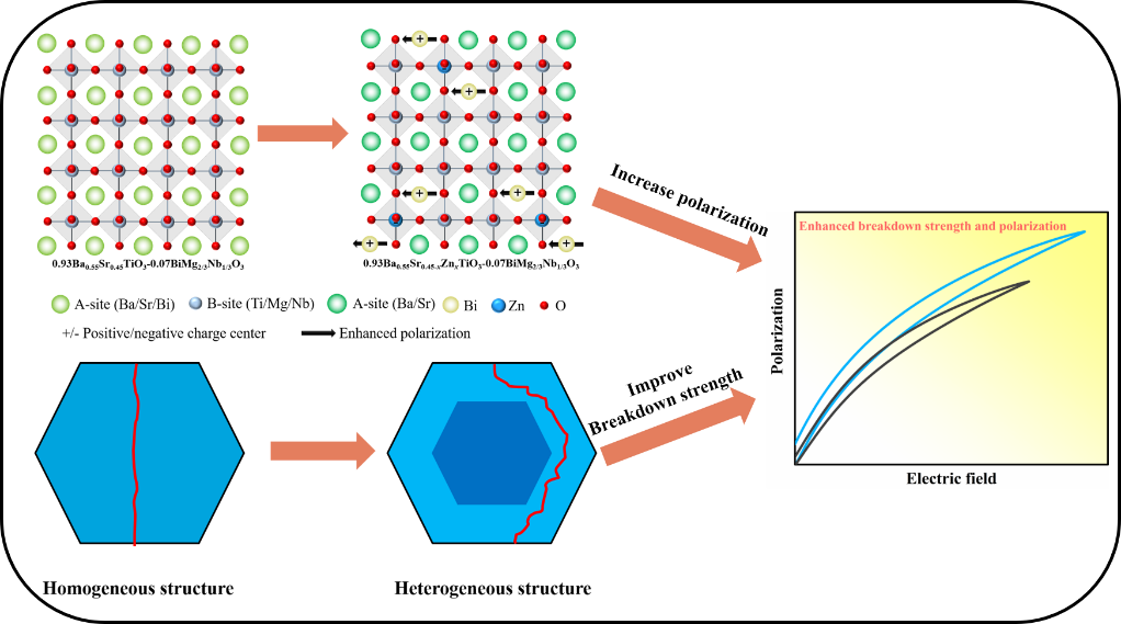 钛酸钡基铁电陶瓷具有高功率密度、高耐电强度和充放电速度快等优点,在电力电子和脉冲功率系统中具有重要应用。介质陶瓷的有效介电常数(ΔP/ΔE)和耐电强度(BDS)本征上相互制约,当前研究主要是通过降低有效介电常数,提高耐电强度或提升有效介电常数来补救储能密度的降低,制约了高功率脉冲储能器件向轻量化、小型化的发展。如何获得宽温范围内高而稳定的储能密度是高功率储能器件应用必须解决的问题。