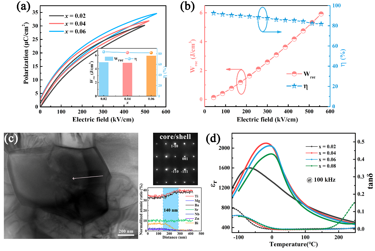 0.93Ba0.55Sr0.39Zn0.06TiO3-0.07BiMg2/3Nb1/3O3陶瓷的(a)P-E回线(最高耐受电场下),(b)储能性能随电场的变化曲线,(c)TEM暗场像,(d)介电温谱。