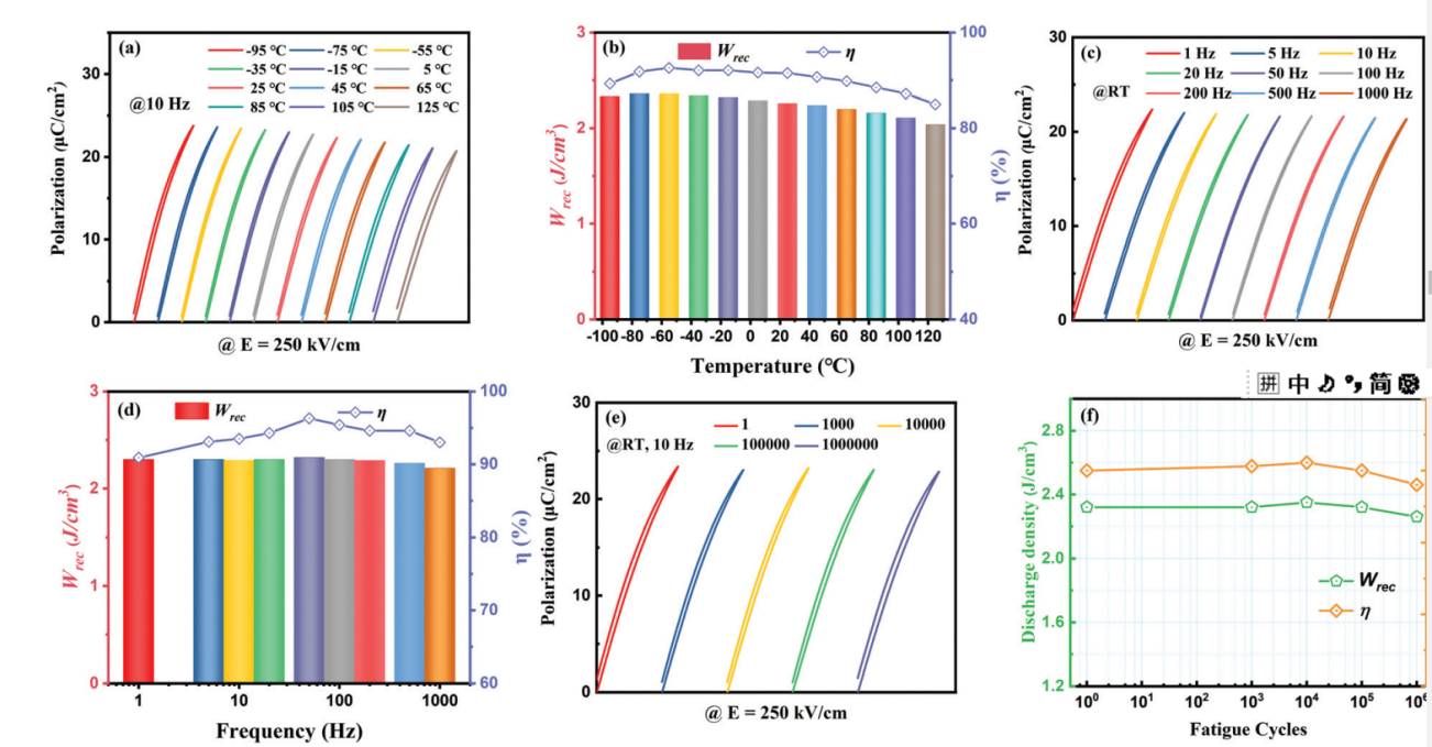 BSBNTH陶瓷不同温度(3a,3b)、不同频率(3c,3d)、不同外场循环次数(3e,3f)下P-E曲线、储能密度和储能效率。