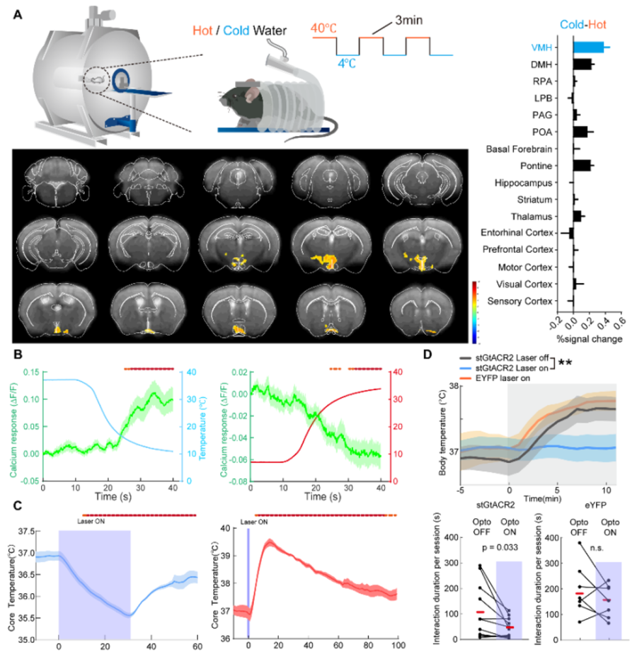 图注(A)左上:小鼠在冷或热刺激时进行功能核磁共振扫描示意图;左下:冷刺激时核磁共振的BOLD信号减去热刺激时BOLD信号的示意图;右侧:不同脑区BOLD信号的统计图。(B)VMHPdyn神经元在冷刺激(左)和热刺激(右)时的钙信号变化。(C)通过光遗传学抑制(左)或激活(右)VMHPdyn神经元时小鼠的体温变化(D)上:抑制VMHPdyn神经元后小鼠在社交行为过程中的体温变化;下:抑制VMHPdyn神经元后小鼠社交行为的变化。
