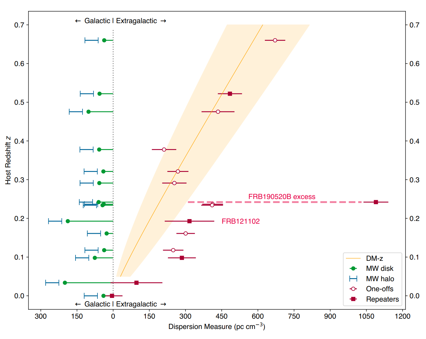 图2. 精确定位的快速射电暴色散-红移关系。清晰可见FRB 20190520B拥有极端的宿主星系电子密度贡献(摘自Niu et al. 2022, Nature,请详见文后的论文链接)。