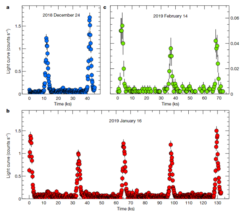 图1,Miniutti等人发现的GSN 069中的QPEs(0.4-2 keV)。a和b是牛顿空间望远镜观测到的X射线波段的光变曲线,c是钱德拉空间望远镜观测到的X射线波段的光变曲线。