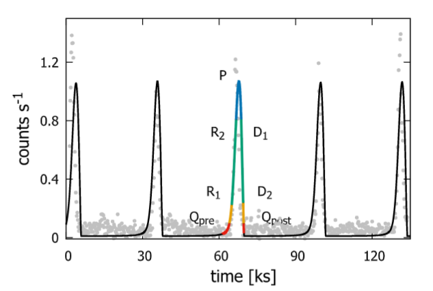 图3,模型光变曲线与观测数据的对比,可以看到模型所给出的光变爆发模式(实线)与观测(灰点)能够很好对应。