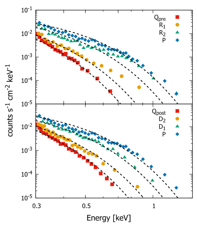 以往研究显示[7],大尺度磁场的存在能够有效地降低吸积盘温度,使得吸积盘趋于稳定,并且也会使得靠近黑洞部分吸积盘结构偏离标准薄盘[15](内边界存在一个额外的力矩)。因此研究人员认为GSN 069可能是一个具有较强大尺度磁场环境的吸积系统。在这种情况下,较高吸积率的吸积盘不稳定区域会被严重限制在最靠近黑洞的一个高温狭窄区域,这也是为什么观测到的QPEs时标会如此之短,并且只表现在高能波段的原因(图2)。