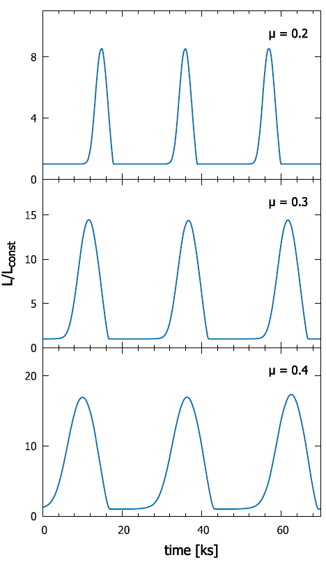 图5,不同粘滞假设条件下的光变曲线。模型的在不同粘滞参数条件下能够爆发出不同“占空比”的光变模式。