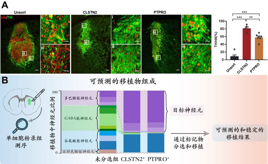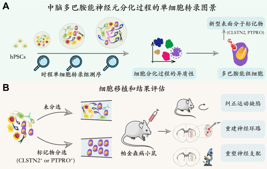 图1 |(A)通过对人类中脑多巴胺能体外分化过程进行时程单细胞转录组,解析了培养物的细胞类型异质性,并找到新型多巴胺能祖细胞的表面分子标记物。(B)将未分选的神经祖细胞与标记物分选的神经祖细胞(CLSTN2+ 或 PTPRO+)移植到帕金森病小鼠模型中,通过行为学、电生理、组织学染色等手段评估移植结果。(C)通过解剖帕金森病小鼠脑中的移植物并进行单细胞转录组的分析,发现新型标记物后的移植物具有稳定可预测的移植物结果,目标神经元(即中脑多巴胺能神经元)高度富集,非目标神经元大部分被剔除。