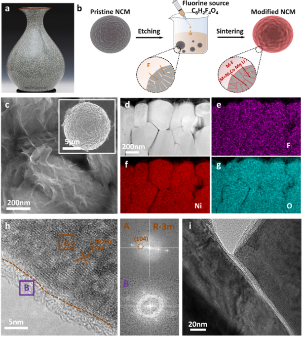 从中国传统瓷器艺术品裂纹釉中获得灵感,通过有机氟酸(四氟对苯二甲酸C8H2F4O4)刻蚀处理并结合高温煅烧制备出金属氟化物在一次/二次颗粒界面均匀包覆改性的LiNi0.8Co0.15Mn0.05O2正极。该方法显著抑制材料晶间裂纹生长,提升了材料的长循环稳定性(25 °C,100%@400圈;60 oC,97%@200圈)。该方法也可以扩展应用至其它过渡金属氧化物正极材料体系,研究成果以“Amorphous fluorine glaze for crack-free nickel-rich layered cathode grains under electrochemical cycling”为题发表于Chemical Engineering Journal期刊,文章链接为https://doi.org/10.1016/j.cej.2022.135227。