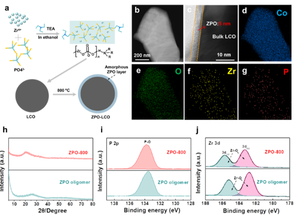 随着锂离子电池储能体系向高纬度、高海拔地区等应用场景的拓展,对正极材料的低温性能提出更高要求。通过一种新颖且简便的软化学法在LiCoO2表面上均匀包覆一层厚度约为5 nm的非晶磷酸锆层,可有效改善其在低温环境的使用性能。得益于较高的界面相容性和更小的极化程度,改性材料在-25 °C和4.6 V下表现出179.2 mAh g-1的高可逆比容量和优越的循环稳定性(91%@300圈)。通过EIS阻抗、接触角、GITT和TEM表征,证明改性材料表面的非晶包覆层对构建浸润性好、离子电导率高和稳定性强的固液电解质界面具有积极效果。研究成果以“Constructing Robust Cathode/Electrolyte Interphase for Ultrastable 4.6 V LiCoO2 under -25 °C”为题发表于ACS Applied Materials & Interfaces期刊,文章链接为https://doi.org/10.1021/acsami.2c02818。