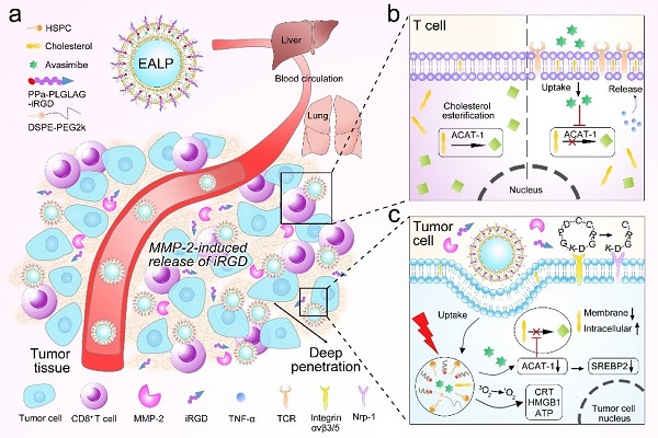 2022年10月28日,上海药物所李亚平团队在Small Methods上发表了题为“Blocking cholesterol metabolism with tumor-penetrable nanovesicles to improve photodynamic cancer immunotherapy”的研究成果。该研究开发了一种基质金属蛋白酶(MMP-2)响应的促渗透纳米粒,通过促进药物瘤内渗透,同步调控CTLs和肿瘤细胞的胆固醇代谢行为,改善CTLs功能,协同增强光动力-免疫治疗抗肿瘤效果。