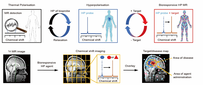 图1:超极化生物反应探针在磁共振功能分子成像中的应用前景。第一行:传统MRI技术受限于低灵敏度,因而低浓度的探针、药物或生物分子无法产生有效信号(左);通过采用超极化技术,磁共振信号可以增强几个数量级(中);对目标物或生物活动过程响应的探针可以获得实时信息(右)。第二行:标准的MRI图像可以得到组织形态信息(左);通过化学位移成像(CSI)或化学交换饱和转移(CEST)的方法可以获取超极化生物响应探针的功能性图像,而且可以提供目标区域的立体局部信息(中);将磁共振图与CSI或CEST数据叠加,可得到目标区域的3D分布图或目标物的浓度(右)。