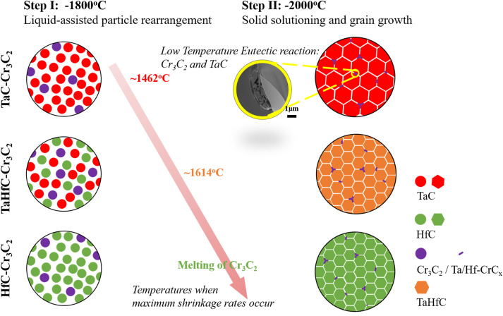 图1 Cr3C2辅助烧结Ta1-xHfxC陶瓷的致密化机理