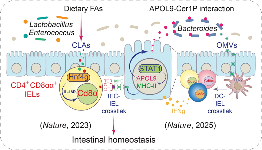 为此,研究团队通过比较正常小鼠与无菌小鼠肠道粘液层蛋白质谱,并结合正常小鼠中结合肠道共生微生物的宿主蛋白质谱进行联合分析,发现一类此前未受关注的新型微生物结合蛋白APOL9a/b。后续研究揭示APOL9a/b分子由小鼠肠上皮吸收细胞 (enterocyte) 分泌,且其表达受到微生物依赖的干扰素信号通路调控。利用人体肠道单细胞测序与蛋白序列进化分析,研究团队同时发现人源APOL1-4分子与APOL9a/b同源,且APOL2在人肠上皮吸收细胞中表达最高。随后,通过将微生物流式分选与16S rRNA测序相结合,研究团队开发了APOL9a-seq技术,并发现APOL9a主要与小鼠肠道拟杆菌目细菌特异性结合。同时,研究团队通过流式技术也发现鼠源APOL9a/b与人源APOL2分子对于人肠道拟杆菌菌株显示同样的选择性结合能力。这种高度特异性的互作方式提示其在宿主-微生物共进化过程中具有重要意义。后续机制研究揭示在生理条件下这些APOL家族分子并不具有明显的抗菌肽活性,但可通过与拟杆菌Cer1P分子结合以诱导其菌膜压力从而促使大量外膜囊泡 (outer membrane vesicles,OMVs) 的分泌。共生菌来源的OMVs具有先天免疫原性,可通过诱导肠道IFNg的产生来促进肠上皮细胞MHC-II分子的表达,并最终介导了一类特殊CD4+CD8αα+肠上皮间T淋巴细胞(intraepithelial lymphocyte,IEL)的分化发育。而APOL9-Cer1P特异性互作介导的OMVs-IFNg-MHC-II-IEL轴对于宿主的抗感染免疫至关重要。