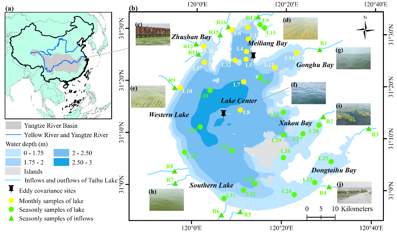 针对这一科学问题,中国科学院南京地理与湖泊研究所研究团队以太湖为研究对象(图1),改进了湖泊碳通量模拟模型“LAKE”的关键水环境参数(pH、叶绿素a)与CO2传输系数算法,并开发了“入湖河流碳输入、大型水生植被、河蟹养殖”等影响湖泊碳通量的过程模块,构建了一个适用于亚热带大型浅水湖泊的碳循环模拟模型(图2)。改进版LAKE模型精准刻画了太湖的碳循环过程(图3),成功复现了太湖水温、湖面叶绿素a浓度、CO2浓度、CO2通量和扩散甲烷(CH4)通量的季节和年际变化特征。