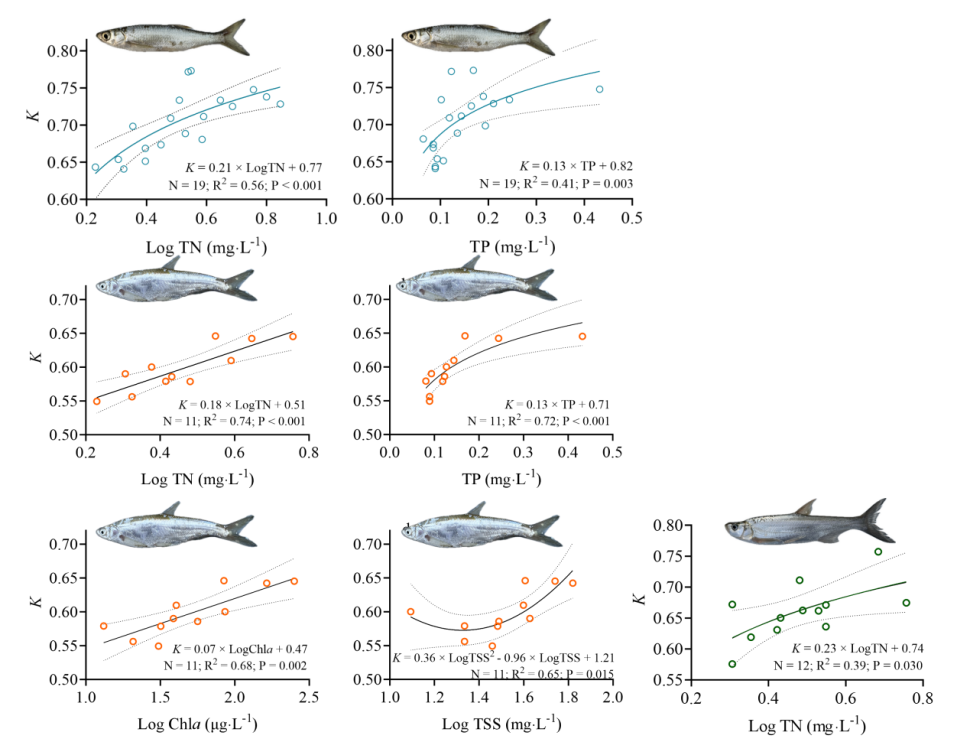 鱼类肥满度指数与水质的关系:鱼类的生长状况指标通常被称为肥满度指数,其作用类似于衡量人体胖瘦程度的BMI指数。不同食性鱼类的生长状况对营养盐升高的响应特征存在种属特异性差异。其中,水质较差河流中的䱗和似鱎越“肥”(肥满度指数高)(图2),但鲫和似鳊的肥满度与水质指标间并无显著相关性。值得注意的是,肉食性鱼类鲌的肥满度随总氮浓度升高而增加(图3)。